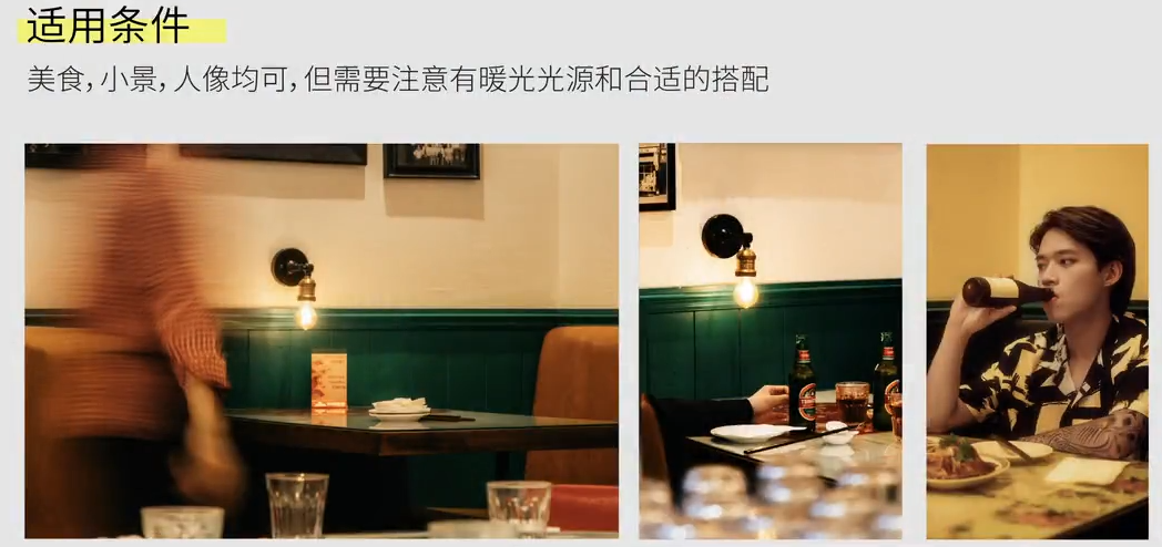在港风餐厅比较容易拍出。使用于美食、餐厅小景、人像,注意要选择有港风或复古感觉的景。