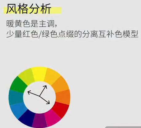 浓郁的暖调:暖黄色是主调,少量红色/绿色点缀的分离互补色模型