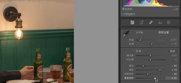 最后调整明度曲线S形,阴影适当提升一点。基本面板微调色温,对比度。
