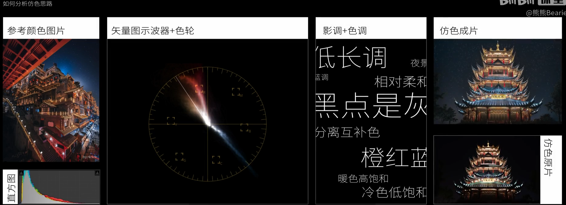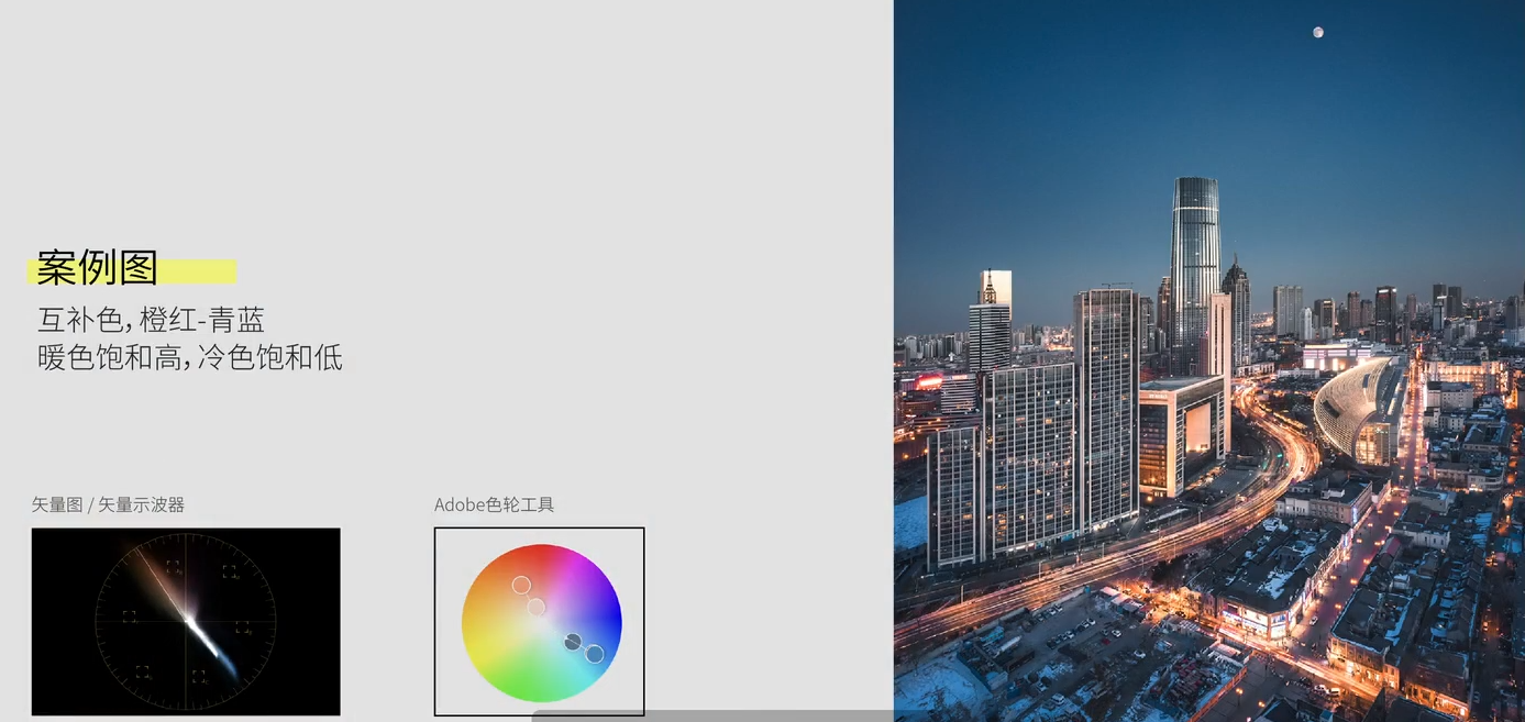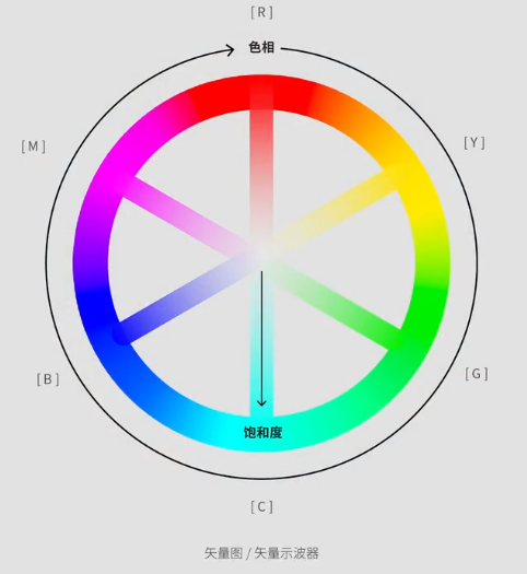 矢量图/矢量示波器,圆弧方向控制色相,半径方向控制饱和度(越靠外饱和度越高),矢量示波器更加专业。