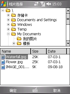 。实地去看了下,才明白,使用了一段时间以后,客户端的数据量增大,程序运行时,缓存的数据越来越多,所占系统内存越大,导致选择相片的对话框无法显示,一闪而过。而CF里面的OpenFileDialog因为mobile的安全限制,只能访问my Document下的文件。于是想寻找一个mobile上的文件选择对话框组件。在codeproject上发现一个不错,可惜是老外用c++写的,并没有COM组件化,CF无法使用。干脆自己写一个。效果如下图