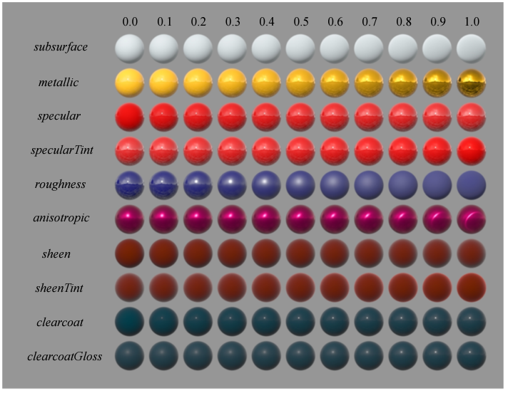 | sheenTint | 光泽颜色 | 对sheen(光泽度)的颜色控制 |
