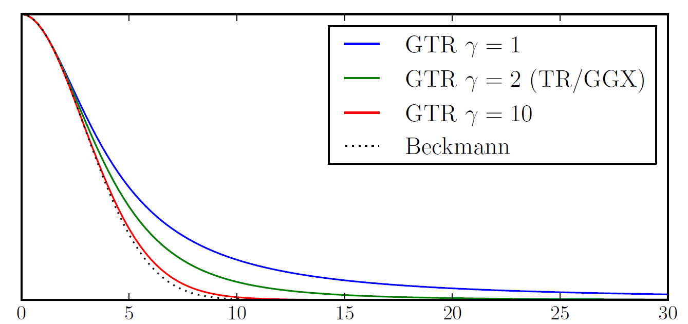 其中,c为缩放系数,a为粗糙度系数取[0,1],当r=1时,GTR为Berry分布,当r=2时,GTR为Trowbridge-Reitz分布。如下图所示: