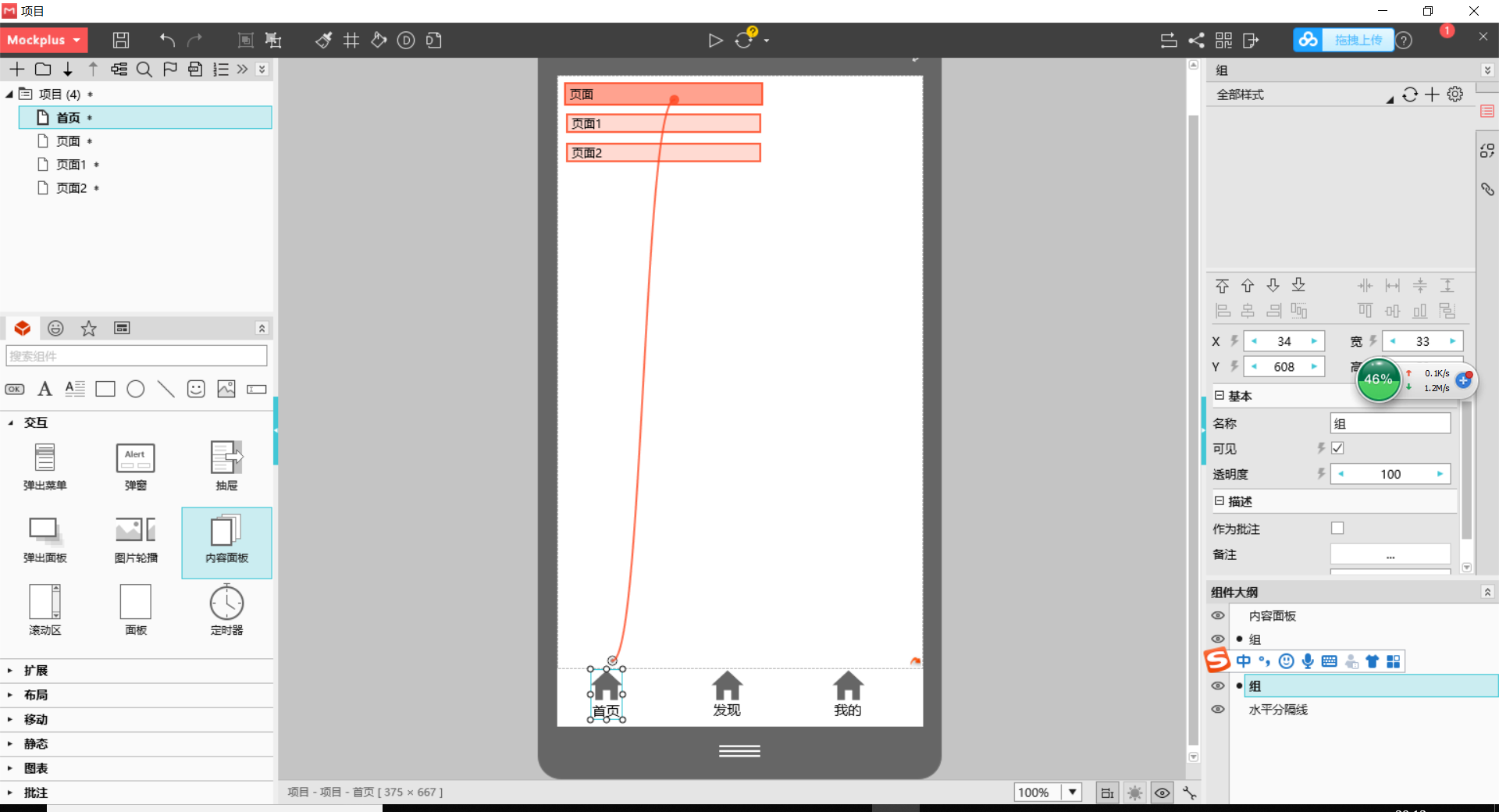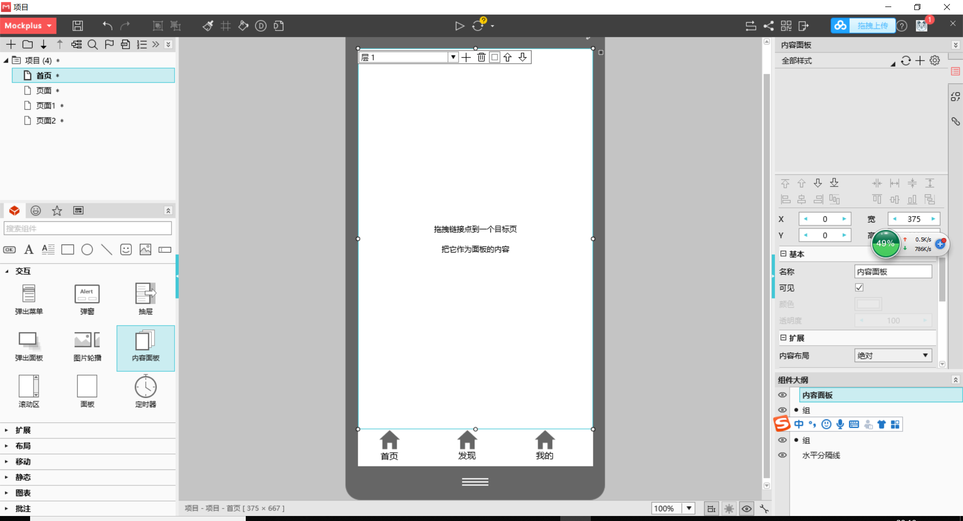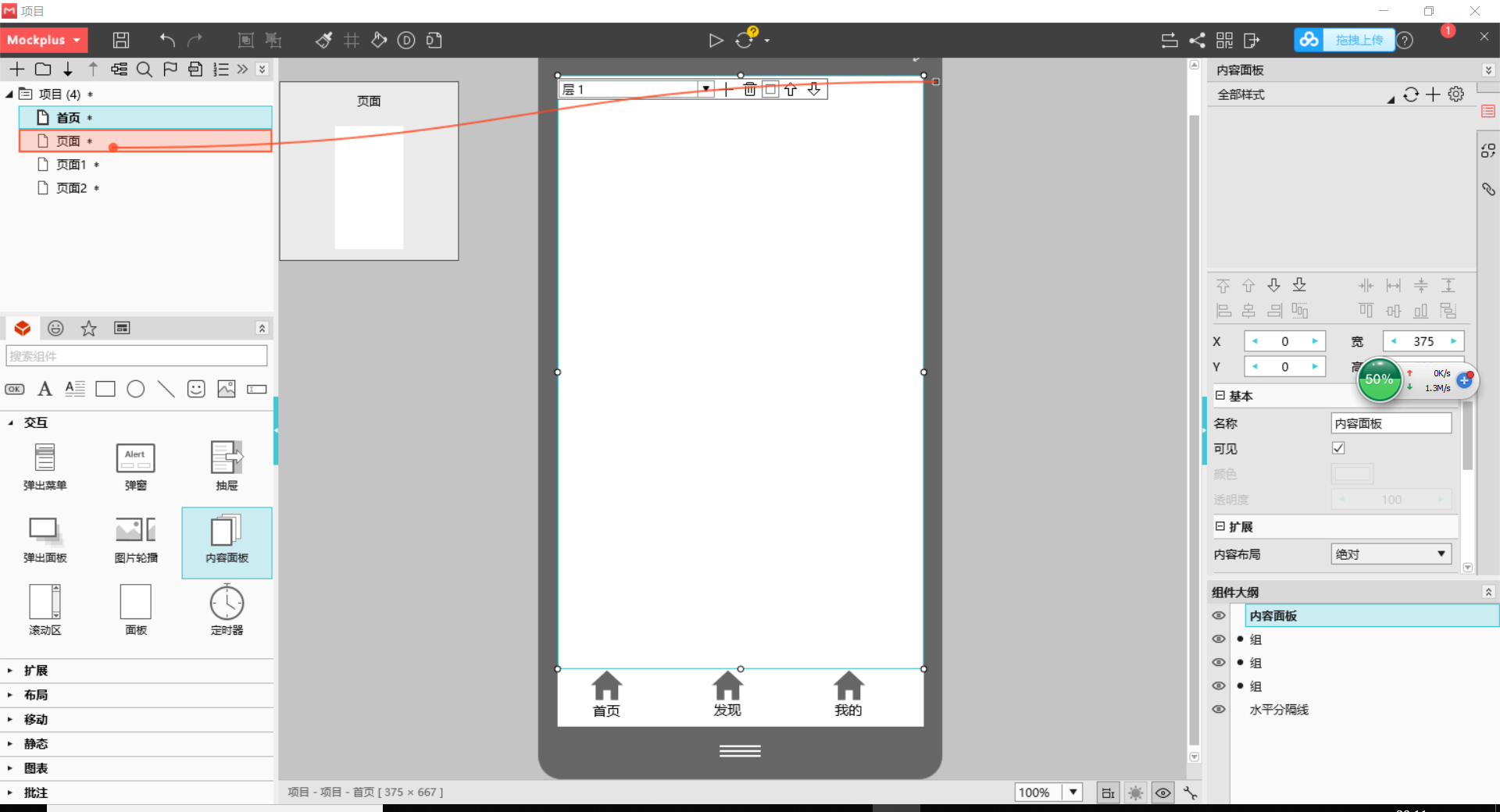1.拖出内容面板,点击“+”创建3个层,每层分别拖拽链接点连接到三个内容页面。