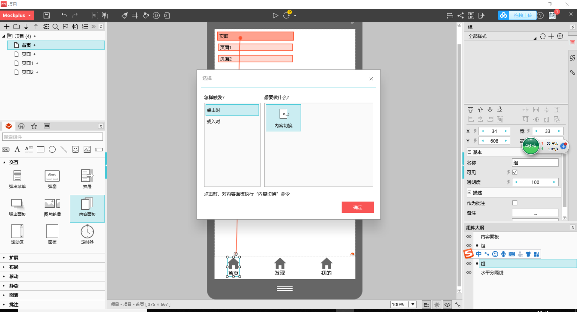 在项目树中新建三个内容页面,在左侧的组件选项卡中搜索需要的组件,拖拽应用即可。