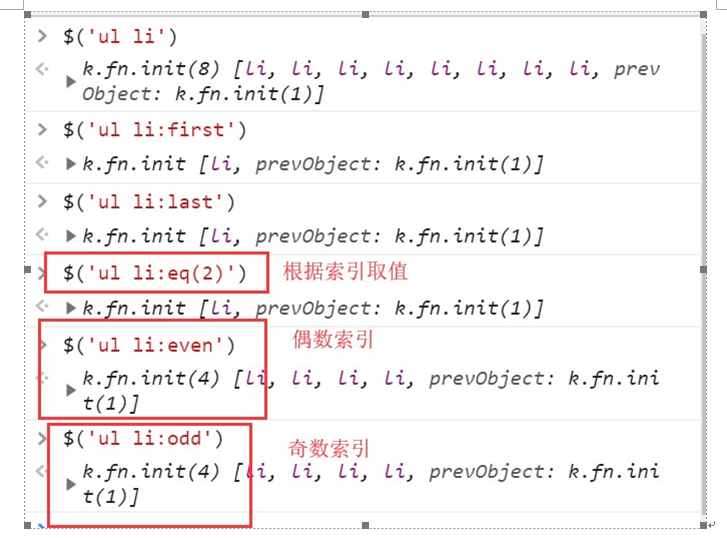 :first // 第一个 :last // 最后一个 :eq(index)// 索引等于index的那个元素 :even // 匹配所有索引值为偶数的元素,从 0 开始计数 :odd // 匹配所有索引值为奇数的元素,从 0 开始计数 :gt(index)// 匹配所有大于给定索引值的元素 :lt(index)// 匹配所有小于给定索引值的元素 :not(元素选择器)// 移除所有满足not条件的标签 :has(元素选择器)// 选取所有包含一个或多个标签在其内的标签(指的是从后代元素找) #事例: $("div:has(h1)")// 找到所有后代中有h1标签的div标签 $("div:has(.c1)")// 找到所有后代中有c1样式类的div标签 $("li:not(.c1)")// 找到所有不包含c1样式类的li标签 $("li:not(:has(a))")// 找到所有后代中不含a标签的li标签