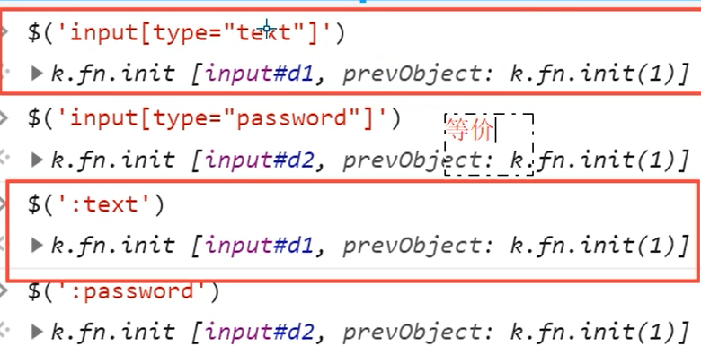 [attribute] [attribute=value]// 属性等于 [attribute!=value]// 属性不等于 // 示例 <input type="text"> <input type="password"> <input type="checkbox"> $("input[type='checkbox']");// 取到checkbox类型的input标签 $("input[type!='text']");// 取到类型不是text的input标签