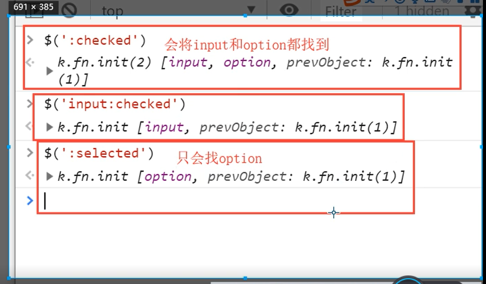 :text :password :file :radio :checkbox :submit :reset :button #特别注意:如果input标签的为单选框或多选框有checked时只能用下列方法查找不然会连select标签一起查找到 $('input:checked') 表单对象属性: :enabled :disabled :checked :selected 事例: <select id="s1"> <option value="beijing">北京市</option> <option value="shanghai">上海市</option> <option selected value="guangzhou">广州市</option> <option value="shenzhen">深圳市</option> </select> $(":selected") // 找到所有被选中的option
