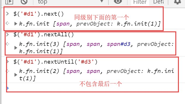 $("#id").next() 同等级下一个 $("#id").nextAll() 同等级下面所有 $("#id").nextUntil("#i2") 同等级下面一直查找不包括id为i2的标签