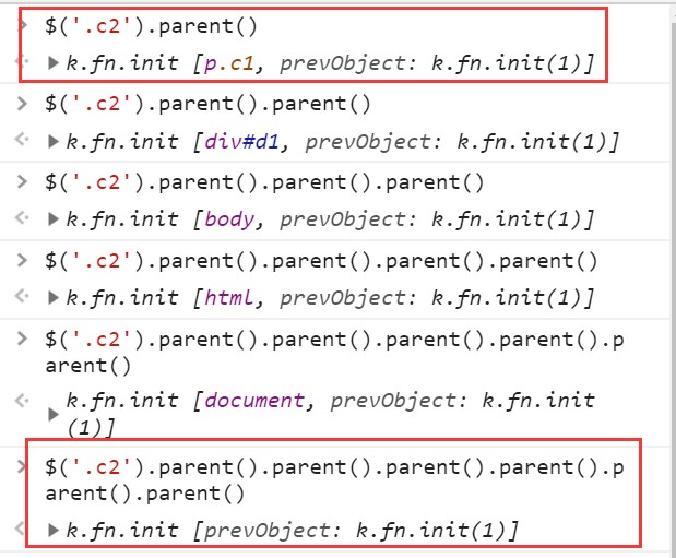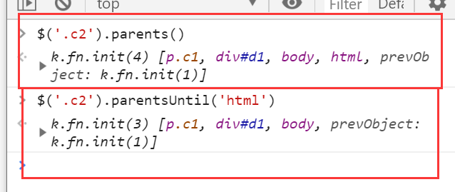 $("#id").parent() 上一级标签(父标签,可叠加) $("#id").parents() // 查找当前元素的所有的父辈元素(当前标签的父类,父类的父类,...) $("#id").parentsUntil() // 查找当前元素的所有的父辈元素,直到遇到匹配的那个元素为止。