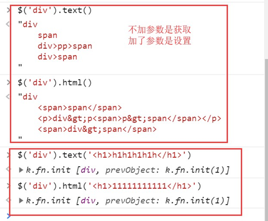 html()// 取得第一个匹配元素的html内容 html(val)// 设置所有匹配元素的html内容 text()// 取得所有匹配元素的内容 text(val)// 设置所有匹配元素的内容 # 输入框 单选 多选框 val()// 取得第一个匹配元素的当前值 val(val)// 设置所有匹配元素的值 val([val1, val2])// 设置多选的checkbox、多选select的值