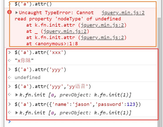 attr(attrName)// 返回第一个匹配元素的属性值 attr(attrName, attrValue)// 为所有匹配元素设置一个属性值 attr({k1: v1, k2:v2})// 为所有匹配元素设置多个属性值 removeAttr()// 从每一个匹配的元素中删除一个属性