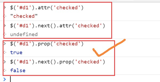 对于返回布尔值的比如checkbox、radio和option的是否被选中都用prop。