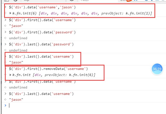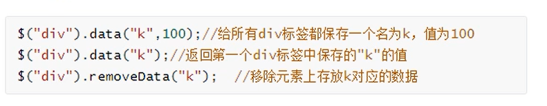 .data(key, value): $("div").data("k",100);//给所有div标签都保存一个名为k,值为100