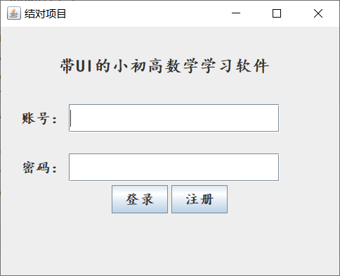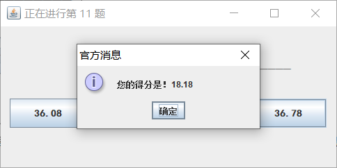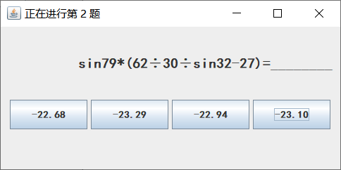 我们的程序用swing类的组件完成各个界面,由我和梁原韶同学合作完成整个程序,我负责的部分是根据随机生成的题目字符串生成一个答案,并且在正确答案附近范围内生成三个错误答案,我的搭档梁原韶同学负责的部分是各个界面和监听器的添加以及一些逻辑部分,界面部分复用了一部分他在个人项目阶段写的部分。