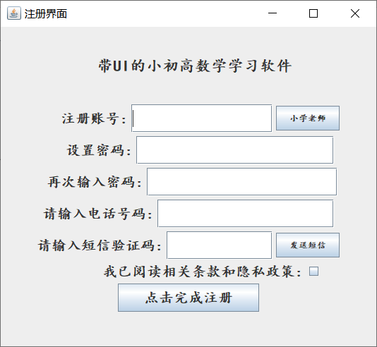 这部分是项目的一个难点,涉及到了第三方的API的调用,界面用流式布局设计,输入了要注册的账号和密码之后需要输入电话并确认短信验证码,之后才能完成注册。