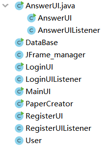 图中所示就是我们结对项目的整个项目代码结构,可以看到,每个界面都有一个UI类和监听器Listenener类,监听器类会继承ActionListener类的功能函数,两个类分别负责整个界面的界面显示分布和点击动作获取之后的逻辑部分。