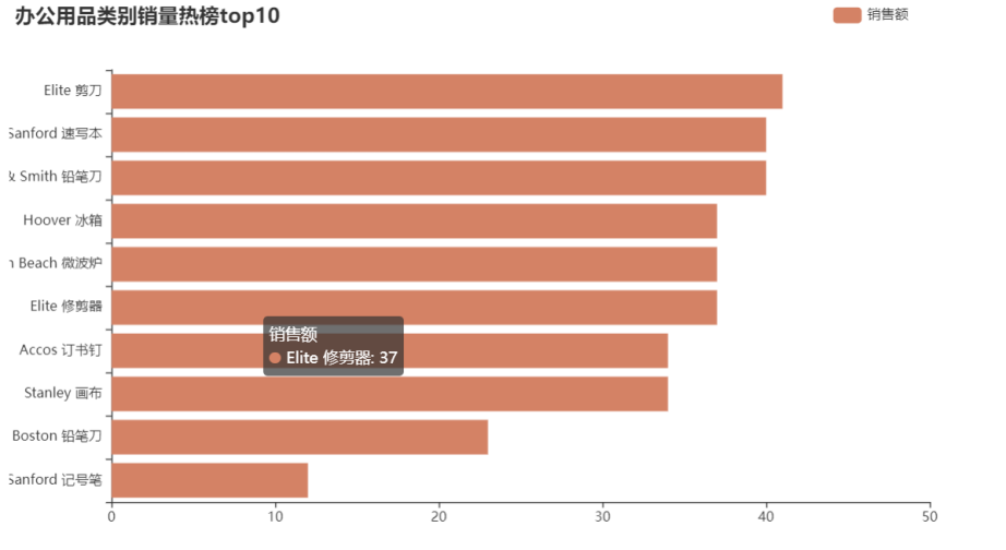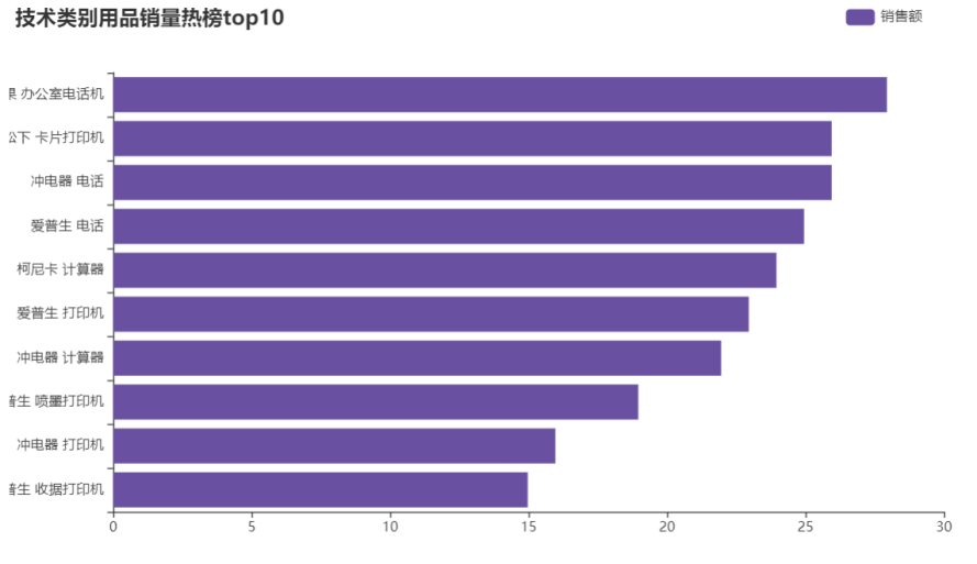 4.办公用品类卖的最多的时剪刀,家具类热销榜排名前10的都是桌子,但结合之前的商品类别-利润情况中,桌子是负利润的,则应该考虑桌子成本因素。技术类别中,销量top10中打印机占50%,则进货时也可考虑多进打印机。