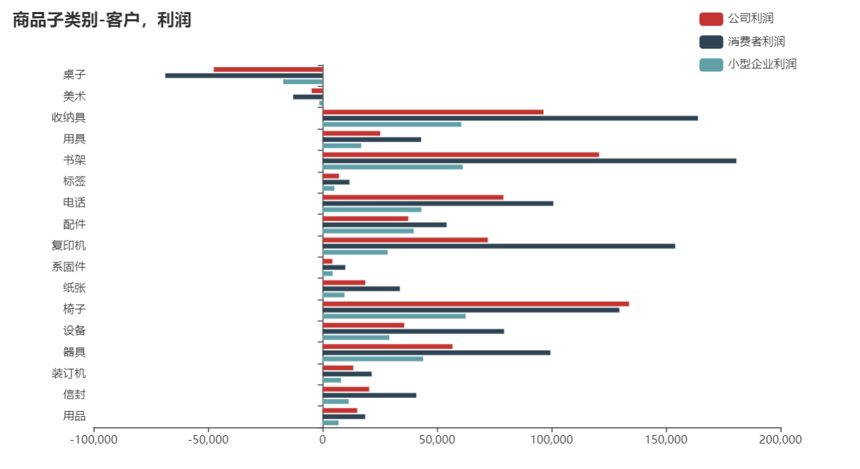 5. 通过销售额,利润可以看出消费者类型用户是我们的主要客户,接着是公司,然后是小型企业。销售额与利润排名在前的书架,复印机等都是消费者购买很多,在售卖时考虑到给消费者客户多推荐书架、收纳具,复印机等商品。