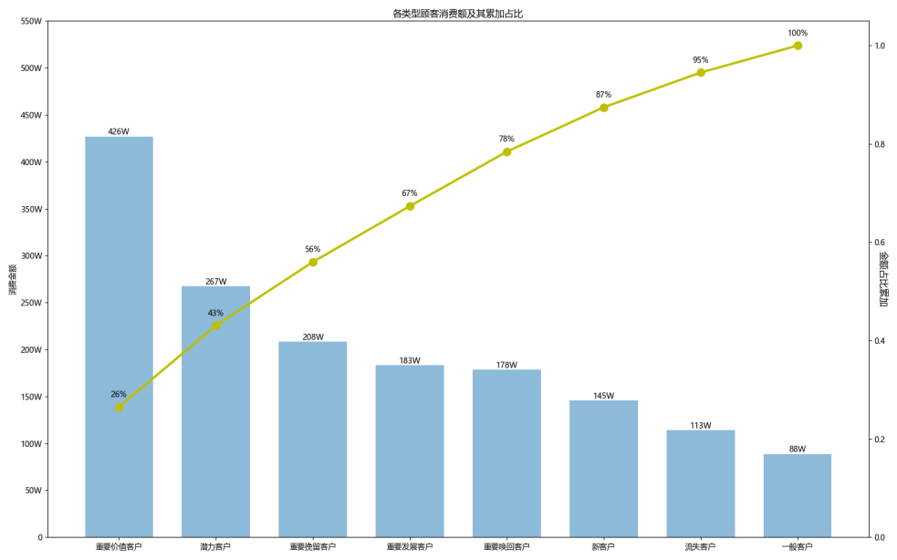 plt.savefig("各类型顾客消费额及其累加占比.png", dpi=300)