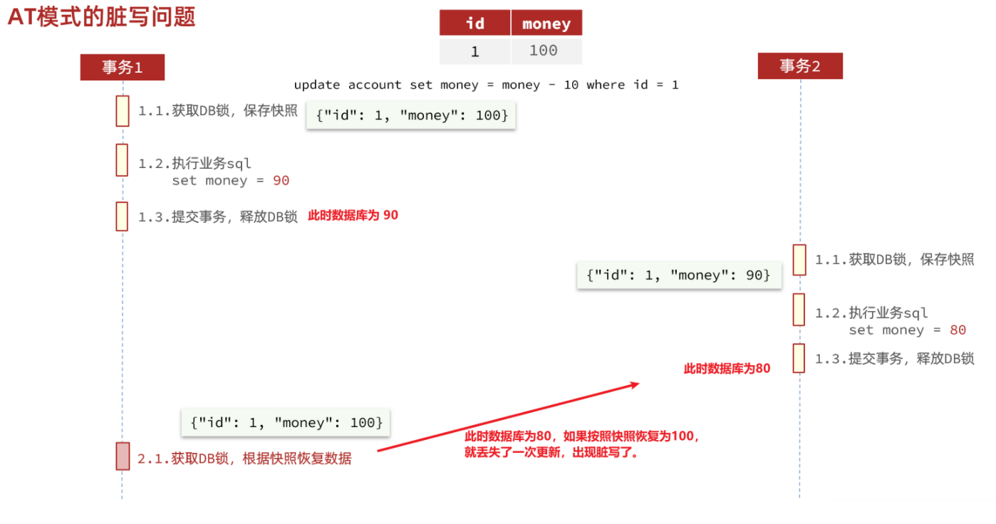在多线程并发访问AT模式的分布式事务,会出现脏写问题,如图: