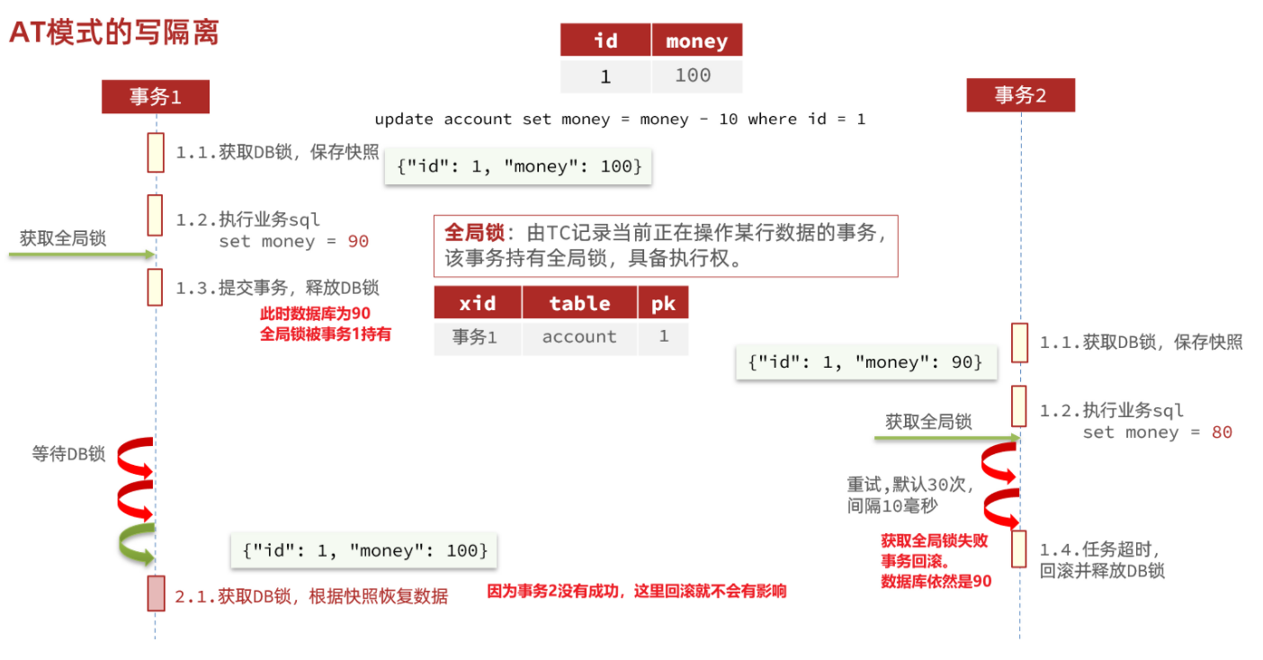 AT模式同样是分阶段提交事务的模型,不过弥补了XA模式锁定资源周期长的问题。