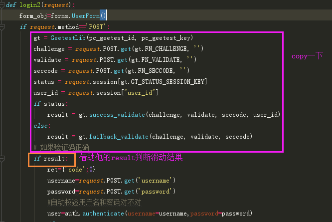 def login(request): form_obj=forms.UserForm() if request.method=='POST': ret={'code':0} username=request.POST.get('username') password=request.POST.get('password') v_code=request.POST.get('v_code','') if v_code.upper()==request.session.get('v_code',''): #自动校验用户名和密码对不对 user=auth.authenticate(username=username,password=password) if user: # 内置的login方法 # 1. 生成Session数据,存一下user_id 然后把sessionid写入Cookie # 后续每一次请求来的时候,AuthenticationMiddleware中的process_request方法中 # 会自动帮我们取到user_id,然后到数据库中拿出user对象,然后添加到request.user属性中 --> request.user = user # 后续我们都可以通过request.user拿到当前的登陆用户对象 auth.login(request,user) ret['data']='/home/' else: ret['code']=1 ret['data']='用户名或密码错误' else: ret['code']=1 ret['data']='验证码错误' return JsonResponse(ret) return render(request,'login.html',{'form_obj':form_obj})
