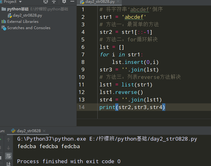 字符串倒序是经常在面试中遇到的问题。作为python初学者,在一次面试中我遇到了这个问题。我当时回答用for循环解决:遍历原字符串将每一次遍历元素插入到列表‘0’的位置来实现倒序,再将列表转换成字符串。当时想到的另一个方法是将字符串转化成列表,用列表reverse方法将列表倒序,然后在用join方法将列表拼接成字符串。今天才了解到最新简单的方法str[::-1]就能实现。