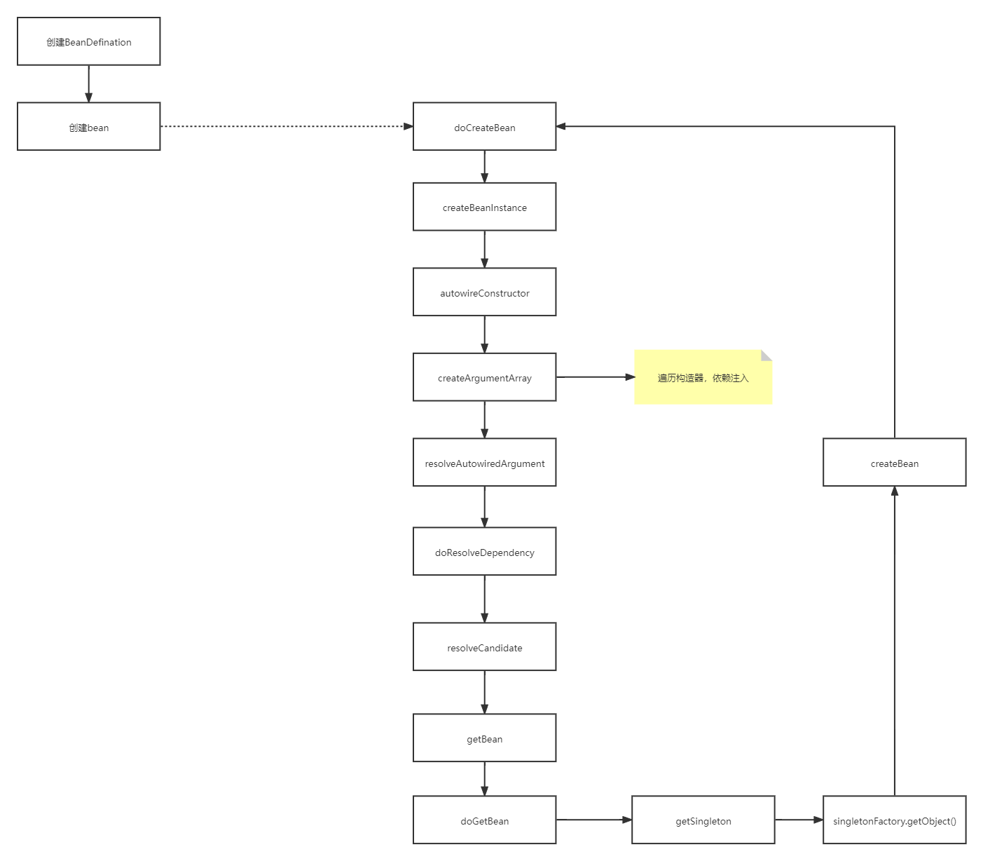通过构造器,找到构造器入参,并从容器内部找到对应Bean的实例,没有则创建依赖的Bean,是一个循环的过程,调用链如下: