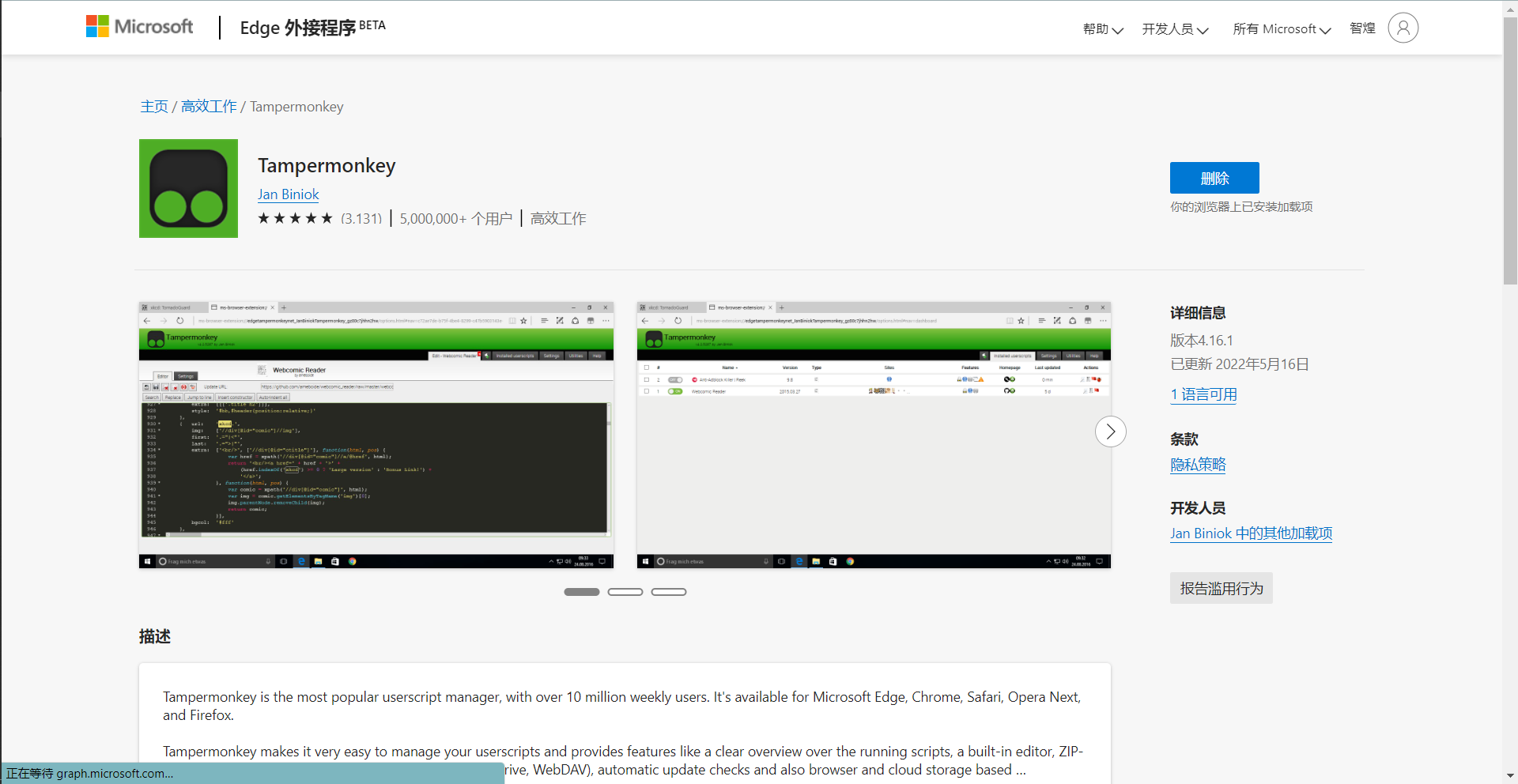 Edge浏览器访问:Tampermonkey - Microsoft Edge Addons,如下所示,点击安装即可。