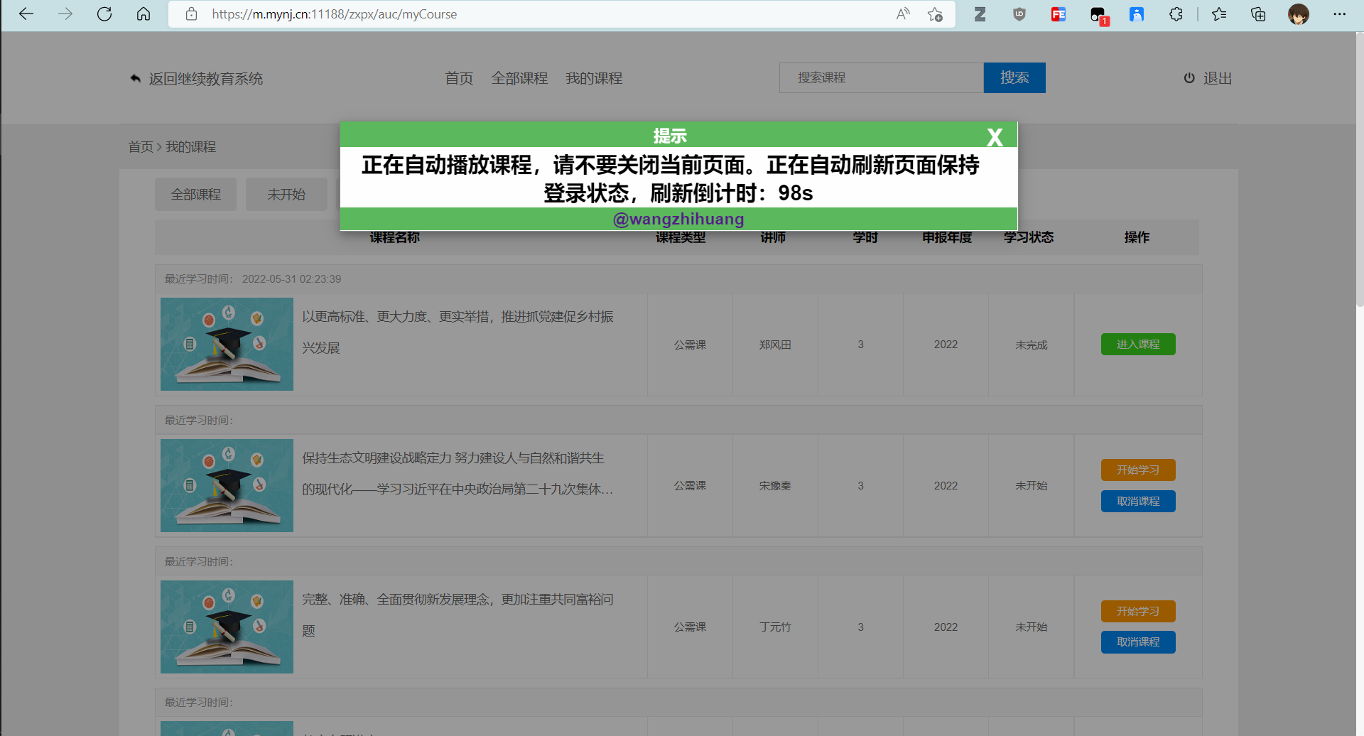 此脚本只实现了课程列表获取及自动播放,每个课程视频看完后仍需要答题通过才能获取学时。操作很简单,跟着下面一步步操作即可。