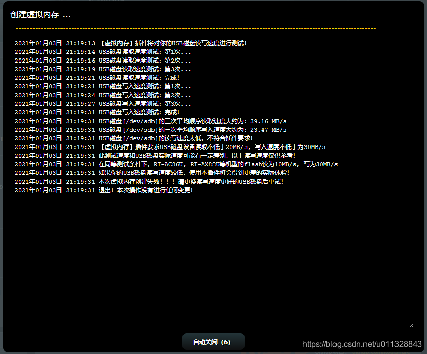 【已解决】AC86U ML改版固件虚拟内存创建失败,提示USB磁盘读写速度不满足要求