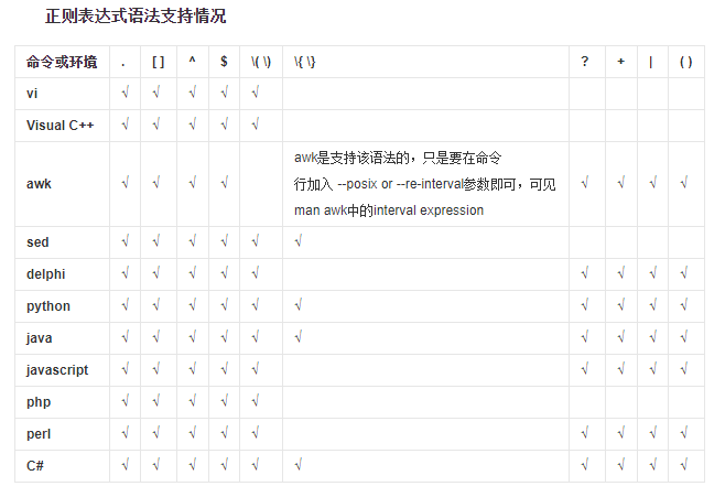 下面给出各种开发软件对正则中的不同语法的支持情况,同学们可以根据所使用的的开发语言选用恰当的语法结构