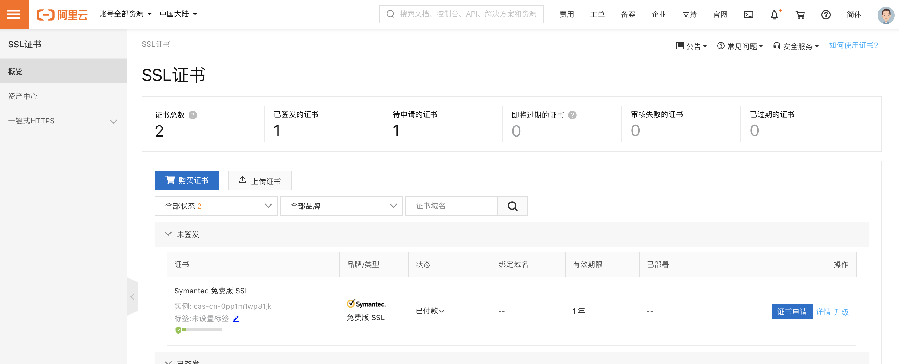 从域名提供商网站购买ssl证书,阿里云个人版的ssl证书是免费的,其他平台自行测试。