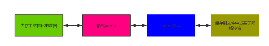 ##----------------------------序列化 import pickle dic={'name':'alvin','age':23,'sex':'male'} print(type(dic))#<class 'dict'> j=pickle.dumps(dic) print(type(j))#<class 'bytes'> f=open('序列化对象_pickle','wb')#注意是w是写入str,wb是写入bytes,j是'bytes' f.write(j) #-------------------等价于pickle.dump(dic,f) f.close() #-------------------------反序列化 import pickle f=open('序列化对象_pickle','rb') data=pickle.loads(f.read())# 等价于data=pickle.load(f) print(data['age'])