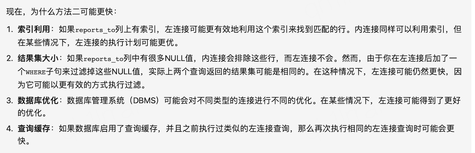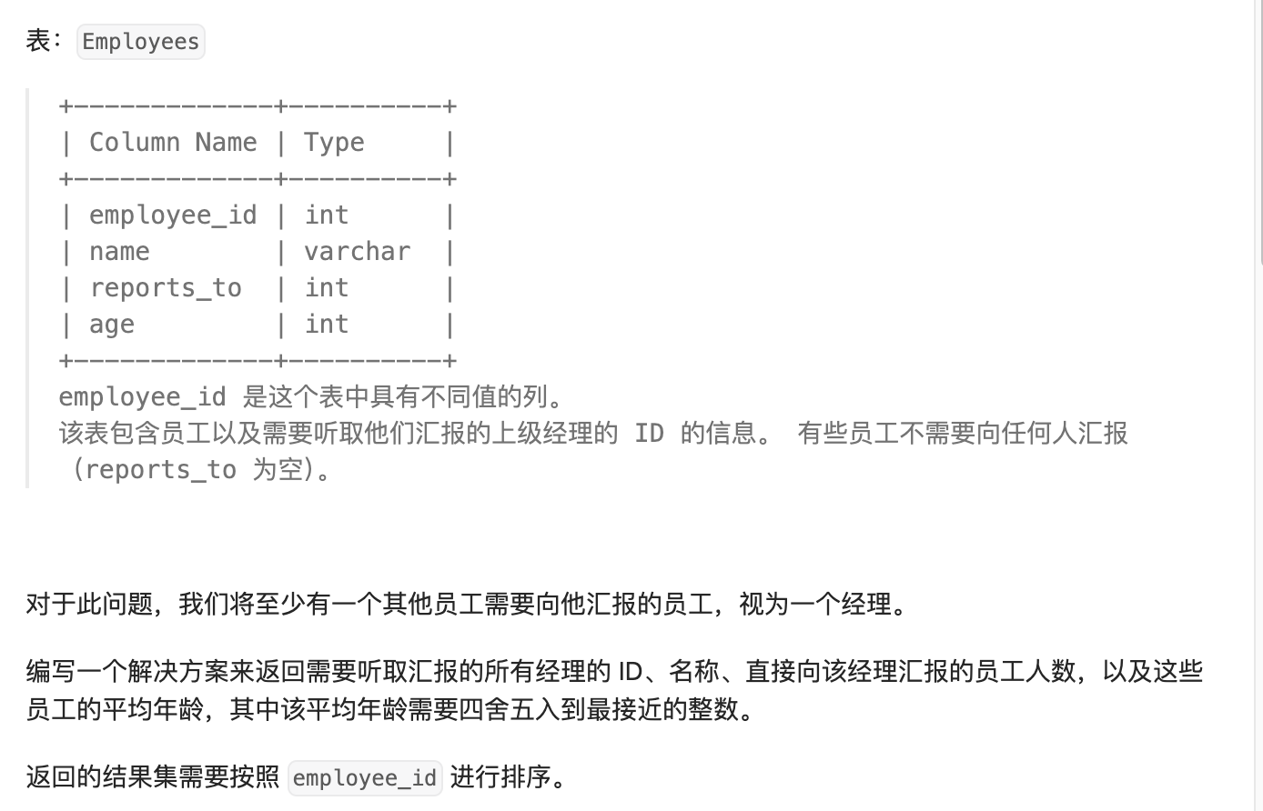 ``` select reports_to, count(employee_id) AS reports_count, Round(avg(age),0) AS average_age from Employees group by reports_to having count(employee_id)>=1 and reports_to is not null ```答案二:使用内连接。employee_id要和reports_to建立相等关联,输出employee_id对应的name,内连接只会显示键值相同的列