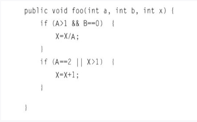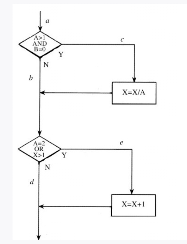 行覆盖用例设计:ace路径(通过在点a处设置A=2,B=0,X=3,每条语句将被执行一次),其它路径如abd就不会被覆盖到。