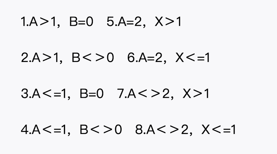 3、条件覆盖:在条件覆盖情况下,要编写足够的测试用例,以确保将一个判断中的每个条件的所有可能的结果至少执行一次