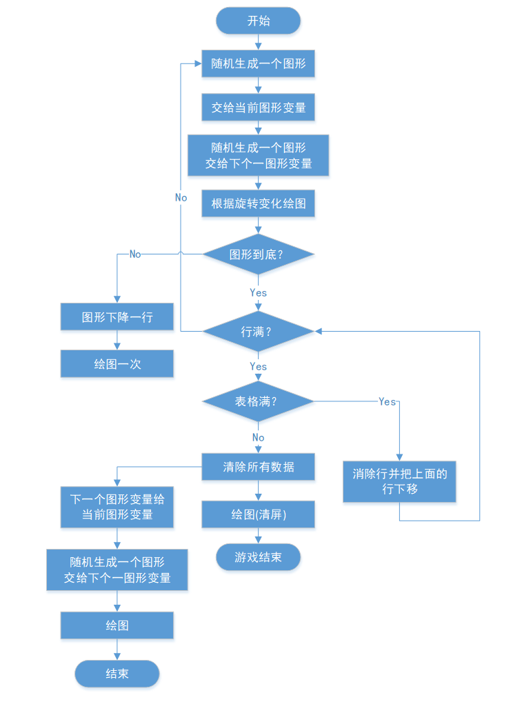 随机给出不同的形状(一字形、田字形、L形、反L形、Z形、反Z形、T字形),下落填充给定区域,填满一行消掉记分,普通下落不计分,加速下落记分,当达到一定分数时提升游戏等级。