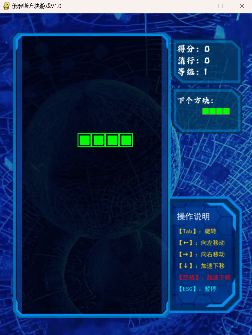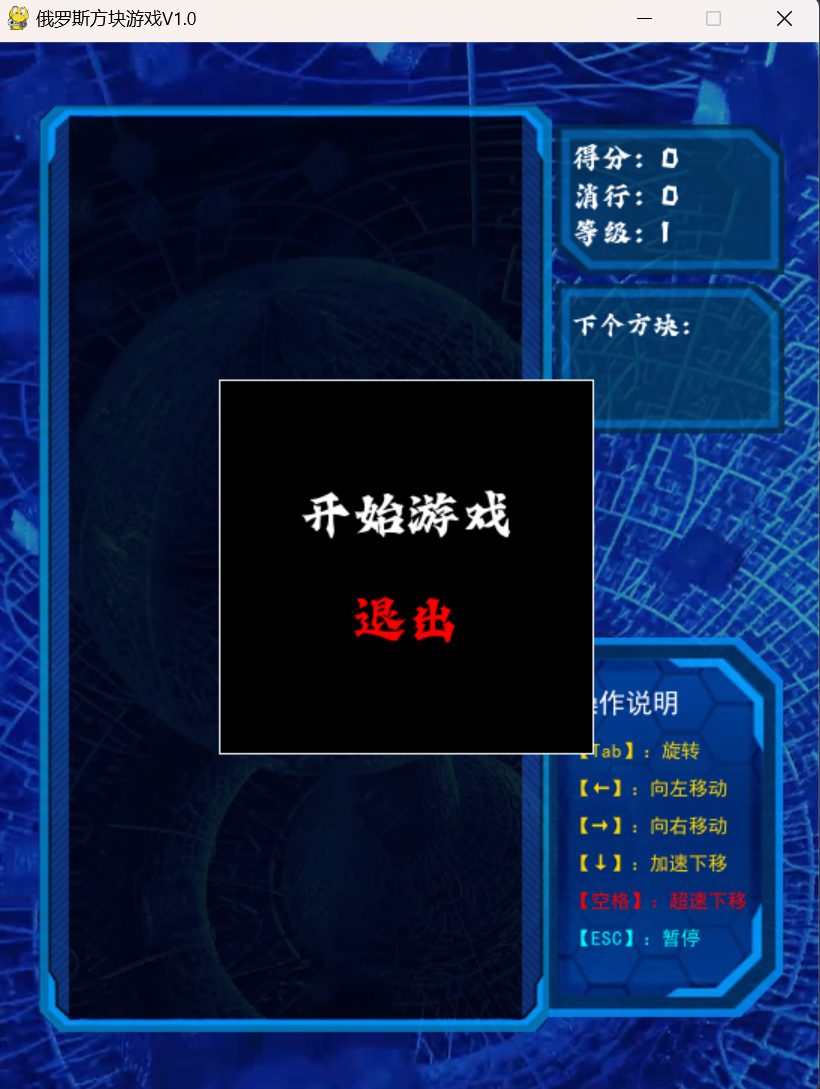 在“开始游戏”按钮的左侧,是一段详细的操作说明文字,尽管由于分辨率限制无法完全看清所有内容,但可以看到包括“Tab”键用于旋转方块、“←”和“→”键分别控制向左和向右移动、“↓”键加速下移等关键信息。此外,还提到了“空格”键用于超速下移和“ESC”键用于暂停游戏的功能,这些设置充分考虑了玩家的操作习惯和游戏流畅性的需求。