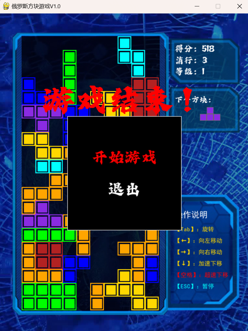 这张图片展示的仍然是俄罗斯方块游戏的一个场景,但是与之前相比,这里出现了一个新的提示:“游戏结束!”这个提示通常意味着玩家已经无法继续消除行或者堆叠方块,导致游戏失败。