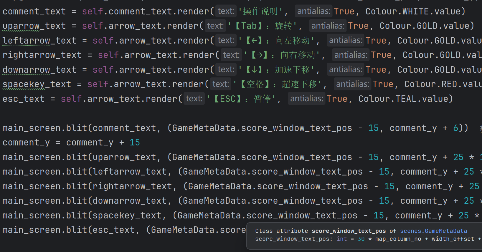 | 游戏难度调整 | 游戏难度随着玩家消除的行数增加而上升,我实现了根据得分动态调整方块下落速度的机制,这样既保证了游戏的挑战性,也提高了可玩性。 |
