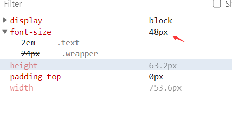 <!DOCTYPE html> <html lang="en"> <head> <meta charset="UTF-8"> <meta http-equiv="X-UA-Compatible" content="IE=edge"> <meta name="viewport" content="width=device-width, initial-scale=1.0"> <title>Document</title> <style> .wrapper { font-size: 24px; } .text { font-size: 2em; //经计算为48px } </style> </head> <body> <div class="wrapper"> <div class="text">哈哈哈哈</div> </div> </body> </html>