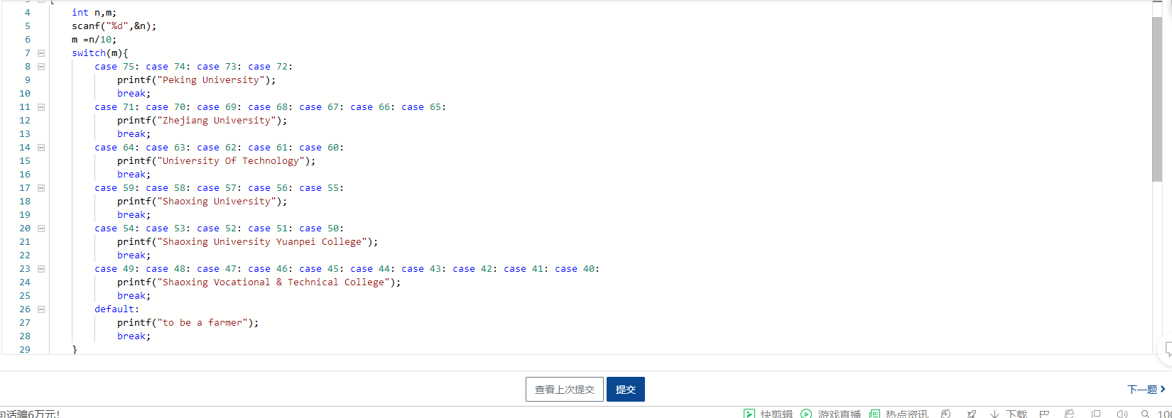 | 10.18-11.1 | 5天 | 100 | 学会了switch的简单用法,知道了怎么在代码里加入符号 | 怎么用switch来表达分段函数 |