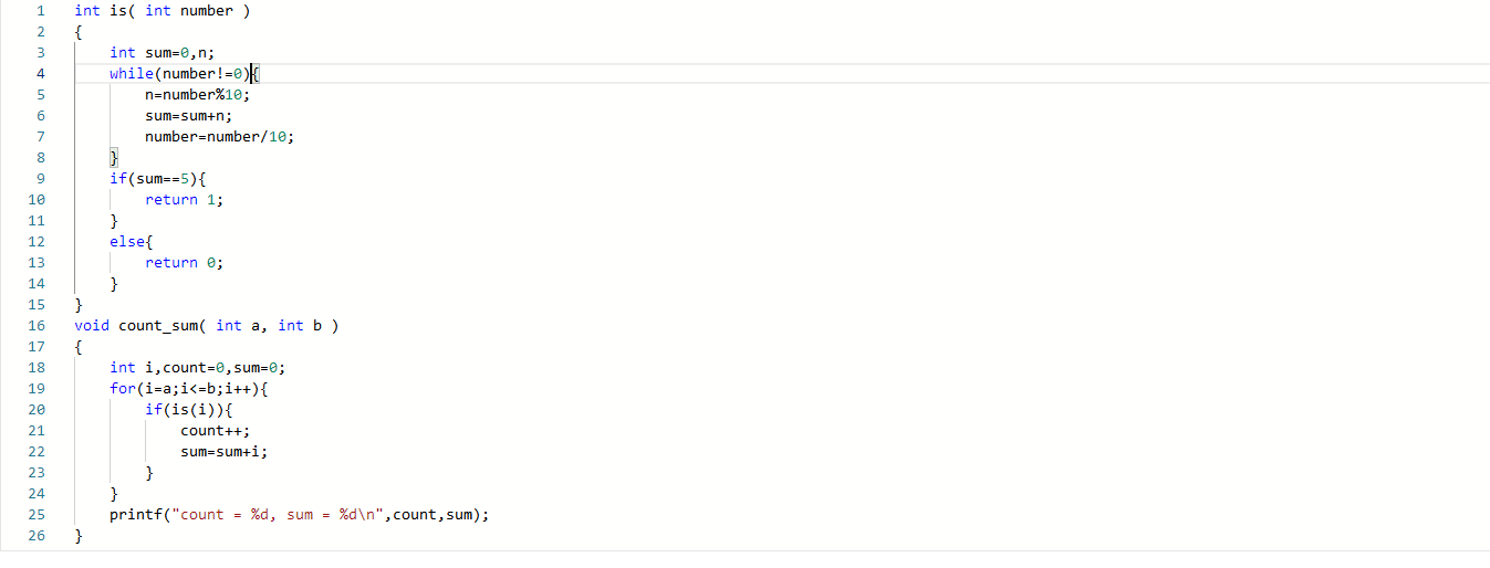 1.2本题要求实现两个函数:一个函数判断给定正整数的各位数字之和是否等于5;另一个函数统计给定区间内有多少个满足上述要求的整数,并计算这些整数的和。