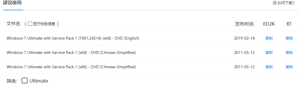 之后下载一个你要的系统,可以从 https://next.itellyou.cn/Original/Index 网站中下载相应的系统 我下的是Windows7,直接复制相应的ED2K 或者 BT 在百度网盘中下载(有的同学可能不知道怎么在网盘中下载,这边做一个简单的介绍)