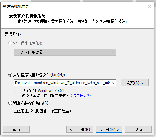 文件都准备好之后就可以创建虚拟机了 在主页上点击创建虚拟机,在浏览中添加你下载的系统文件.iso 然后点击下一步