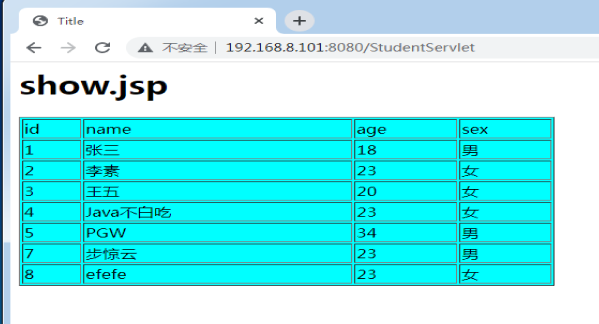 然后在主机上开启服务器 在虚拟机的浏览器中打开网址:http://192.168.8.101:8080/StudentServlet