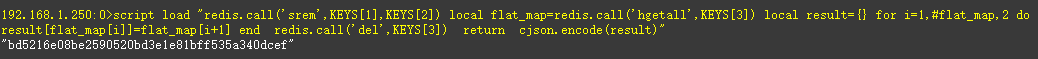 script load "redis.call('srem',KEYS[1],KEYS[2]) local flat_map=redis.call('hgetall',KEYS[3]) local result={} for i=1,#flat_map,2 do result[flat_map[i]]=flat_map[i+1] end redis.call('del',KEYS[3]) return cjson.encode(result)"