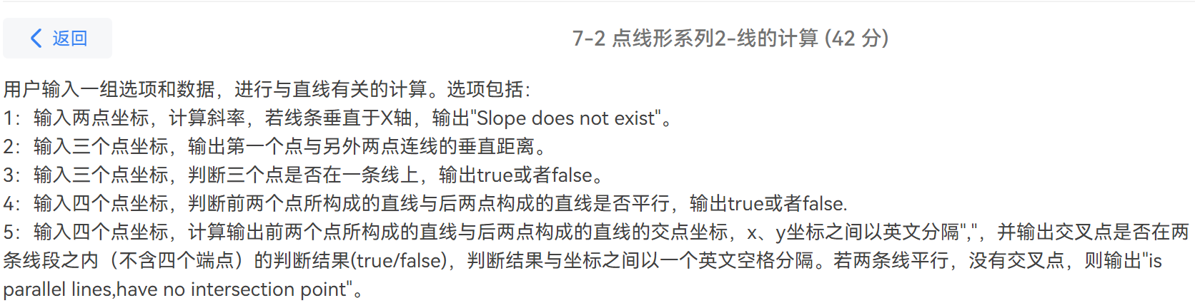 通过数学方法计算出交点坐标,然后通过点的坐标是不是小于线的端点坐标来判断是不是在范围之内。最后在提交源码的时候还是格式错误的测试点以及计算交点的测试点还是没有通过。下面是源码,有待改进: